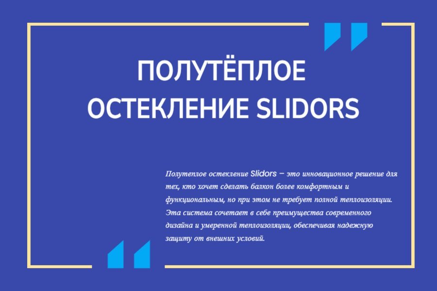 Полутеплое остекление Slidors – это инновационное решение для тех, кто хочет сделать балкон более комфортным и функциональным, но при этом не требует полной теплоизоляции. Эта система сочетает в себе преимущества современного дизайна и умеренной теплоизоляции, обеспечивая надежную защиту от внешних условий.